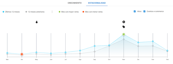 En el gráfico anterior, por ejemplo, se observa que, aunque los protectores solares mantienen buenas ventas durante todo el año, registran un pico de estacionalidad entre noviembre y enero, coincidiendo con la llegada del verano y el aumento de las temperaturas en el hemisferio sur.